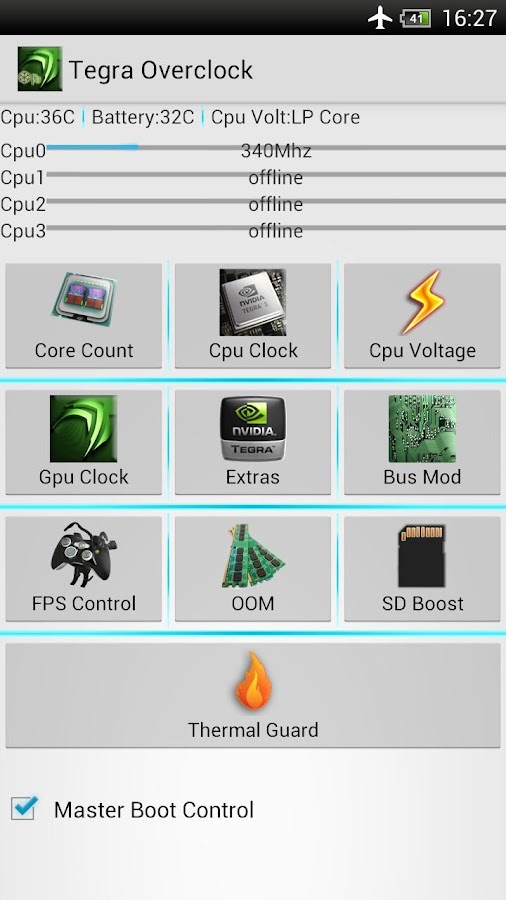 A single app to control your Tegra 3. This tool will enable you to save power or switch to performance on fly. It covers safety features of master boot to enable/ disable your boot settings. Designed in a way that is look different than most market overclocking tools and provide easy to use interface. It can be very effective for those who are frustrated of heat problems or battery drain issues. For gamers it pack an FPS lock that help to get consistent Frame rate while saving battery when Gaming !!